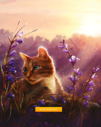 Heathertail is a lithe, light brown tabby she-cat with wide, smoky, heather-blue eyes, and sleek, soft, and thick fur. Heatherpaw is a WindClan apprentice with her mentor being Crowfeather. She befriends Breezepaw, a fellow apprentice. At a Gathering, Heatherpaw warms up to Lionpaw, a ThunderClan apprentice. They agree to meet in secret to play, and Heatherpaw discovers tunnels underneath their territory. They create DarkClan, an imaginary Clan, and pretend to be the leader and deputy with the names of Heatherstar and Lionclaw. Lionpaw breaks off their friendship because he wants to be a loyal warrior. However, Sedgekit, Thistlekit, and Swallowkit follow Heatherpaw into the tunnels and get lost. Together with Hollypaw, Jaypaw, and Breezepaw, the pair find the kits, and Heatherpaw agrees to stop meeting with Lionpaw. During a battle between the Clans, WindClan attacks from the tunnels, and Lionpaw accuses Heatherpaw of breaking their secret. She is horrified when he almost kills Crowfeather, and Lionpaw begins to dream of killing her, much to his horror. She earns her warrior name, Heathertail, and confronts Lionblaze when he sneaks into WindClan territory to gather catmint. She sternly allows him to pass and warns him about becoming like his thought-to-be grandfather Tigerstar.